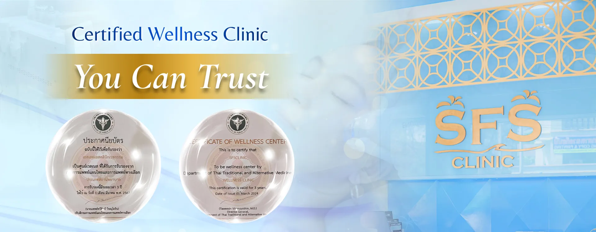 At SFS Clinic, we believe that true wellness and sustainable beauty are essential foundations for a fulfilling life. We are a fully licensed Wellness and Aesthetic Clinic, officially certified by the Ministry of Public Health of Thailand, ensuring the highest standards of medical safety, professional care, and ethical practice.